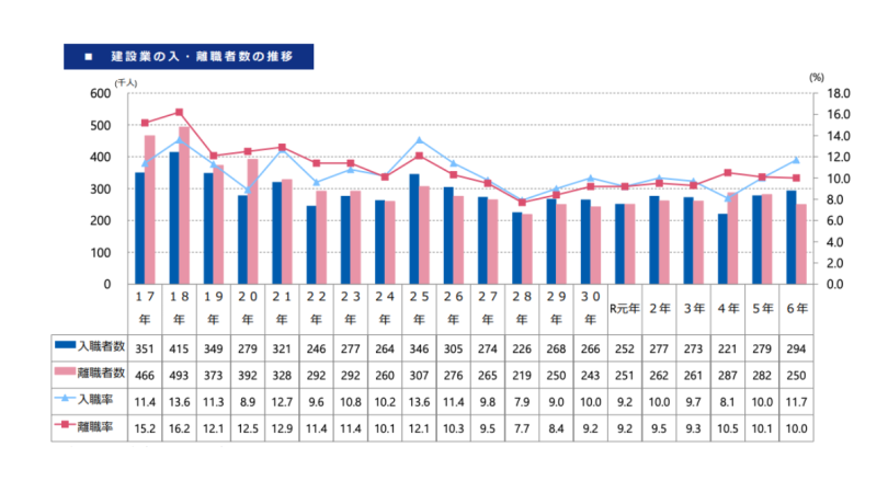 そのため、採用担当者は入社数だけでなく、早期離職率や配属後のフォロー体制まで含めて設計する必要があります。建設業界では、入職者数と離職者数の差が小さい年も多く、定着しない採用はそのまま人手不足の固定化につながります。